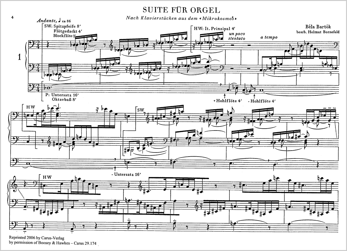 "Against the venture of making accessible to the organ piano compositions by Bartók one can, I admit, put forward not only the reasons which oppose any kind of transcript on whatsoever, but also those which have their origin in the imcompatibility of profane organ writing with the world of the organ. One must, however, not forget that all such transcriptions, no matter which way they go have suffered from the sam dilemma - and yet, they have fulfilled their purpose by helping to chose gaps in the repertory." Helmut Bornefeld