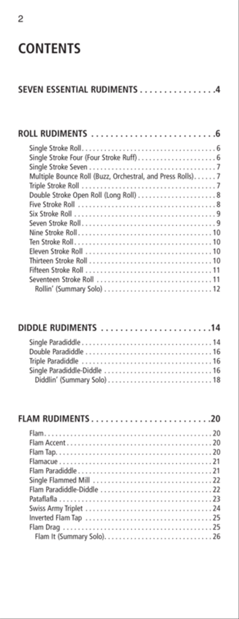 This guide, containing the Percussive Arts Society's 40 International Drum Rudiments, begins by addressing the seven essential rudiments necessary to perform all the other rudiments, and continues by covering roll, diddle, flam and drag rudiment categories with variations of each. Also included are practice patterns and rudimental snare drum solos.