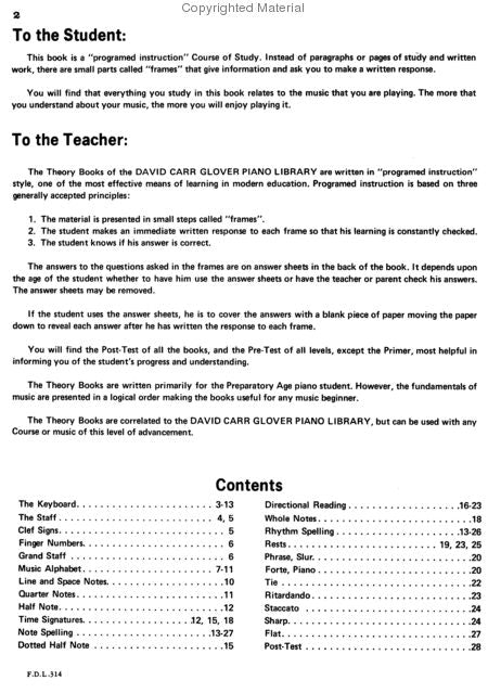The Theory Books of the DAVID CARR GLOVER PIANO LIBRARY are written in "programed instruction" style, one of the most effective means of learning in modern education. Programed instruction is based on three generally accepted principles: 1. The material is presented in small steps called "frames." 2. The student makes an immediate written response to each frame so that his learning is constantly checked. 3. The student knows if his answer is correct. The Theory Books are written for the Preparatory Age piano student. However, the fundamentals of music are presented in a logical order making the books useful for any beginner. The Theory books are correlated to the DAVID CARR GLOVER PIANO LIBRARY, but can be used with any course on music of this level of advancement.
