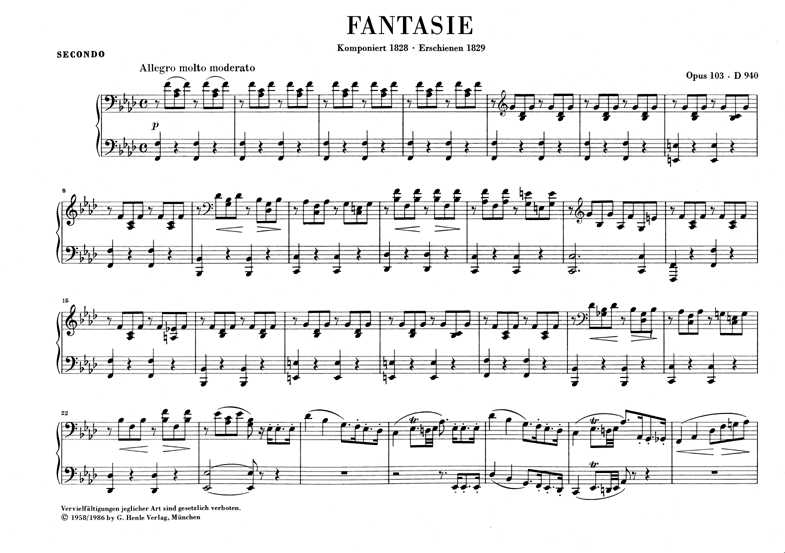 No other great composer left as many works for piano duet as Franz Schubert. Making music with others, often in a social circle, was a solid component of the Schubertian circle of friends. With the Fantasie in F minor D 940 op. post. 103, however, Schubert completely left the sphere of social gatherings and created, in the first months of his last year of life, a work of almost symphonic form, whose elegiac atmosphere at the beginning sets the tone for the entire work. Schubert was apparently aware of the significance of the work and prepared it for printing: the autograph already contained in his hand the opus number of the first edition published in March 1829.
