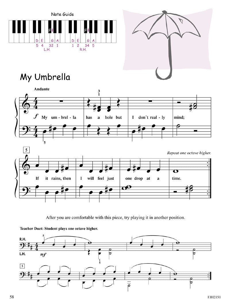 Book 3 of this effective series continues the modern sequential approach to note reading at the piano and focuses on notes in the G positions, F position, and D position. Sharps and flats of the respective positions are introduced, and intervals continue to be reinforced throughout the book. Includes lyrics and teacher duet parts.