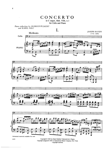 By Joseph Haydn. For Cello and Piano. Cello part edited by Milos Sadlo and Mstislav Rostropovich. Cadenzas by Milos Sadlo. Published by International Music Company.