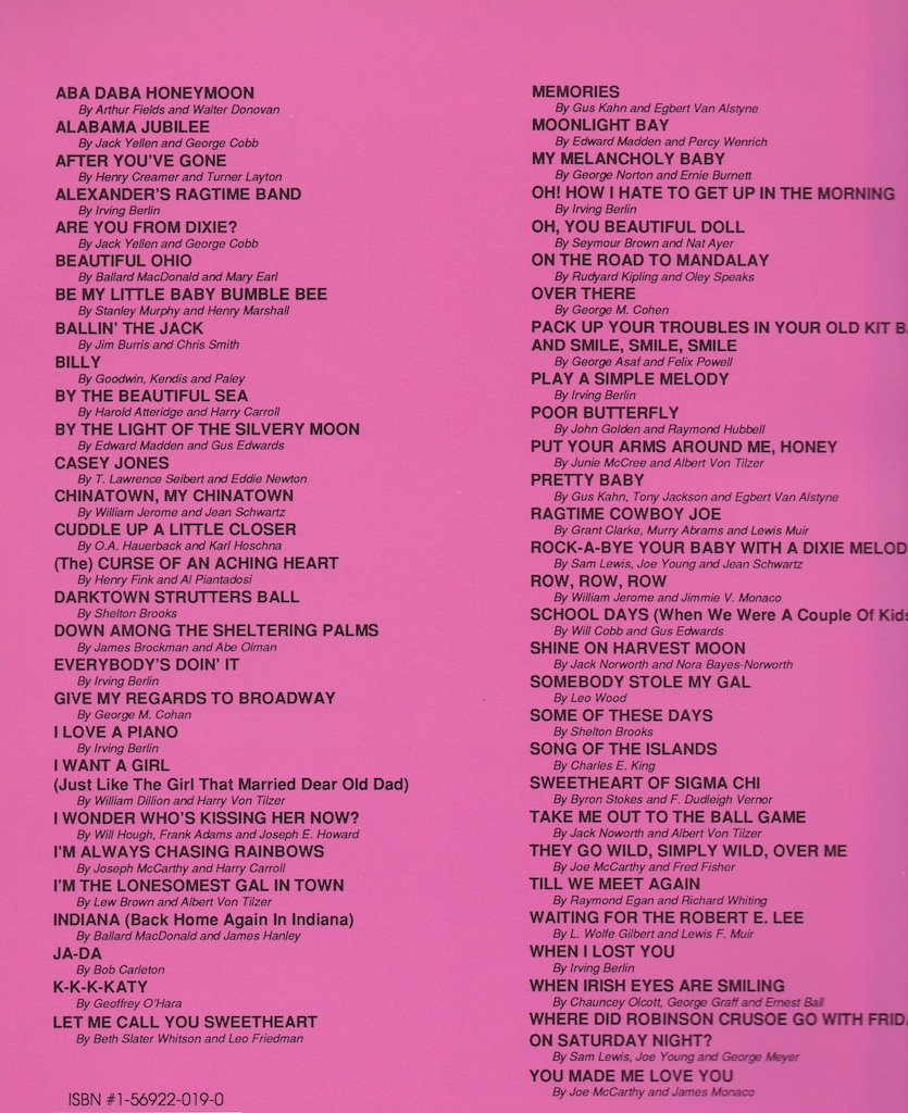 Aba daba honeymoon -- Alabama jubilee -- After you've gone -- Alexander's ragtime band -- Are you from Dixie? -- Beautiful Ohio -- Be my little baby bumble bee -- Ballin' the jack -- Billy -- By the beautiful sea -- By the light of the silvery moon -- Casey Jones -- Chinatown, my Chinatown -- Cuddle up a little closer -- The curse of an aching heart -- Darktown strutters ball -- Down among the sheltering palms -- Everybody's doin' it -- Give my regards to Broadway -- I love a piano -- I want a girl (just like the girl who married dear old dad) -- I wonder who's kissing her now? -- I'm always chasing rainbows -- I'm the lonesomest gal in town -- Indiana (Back home again in Indiana) -- Ja-da -- K-K-K-Katy -- Let me call you sweetheart -- Memories -- Moonlight bay -- My melancholy baby -- Oh! how I hate to get up in the morning -- Oh, you beautiful doll -- On the road to Mandalay -- Over there -- Pack up your troubles in your old kit bag and smile, smile, smile -- Play a simple melody -- Poor butterfly -- Put your arms around me, honey -- Pretty baby -- Ragtime cowboy Joe -- Rock-a-bye your baby with a Dixie melody -- Row, row, row -- School days (when we were a couple of kids) -- Shine on harvest moon -- Somebody stole my gal -- Some of these days -- Song of the islands -- Sweetheart of Sigma Chi -- Take me out to the ball game -- They go wild, simply wild, over me -- Till we meet again -- Waiting for the Robert E. Lee -- When I lost you -- When Irish eyes are smiling -- Where did Robinson Crusoe go with Friday on Saturday night? -- You made me love you