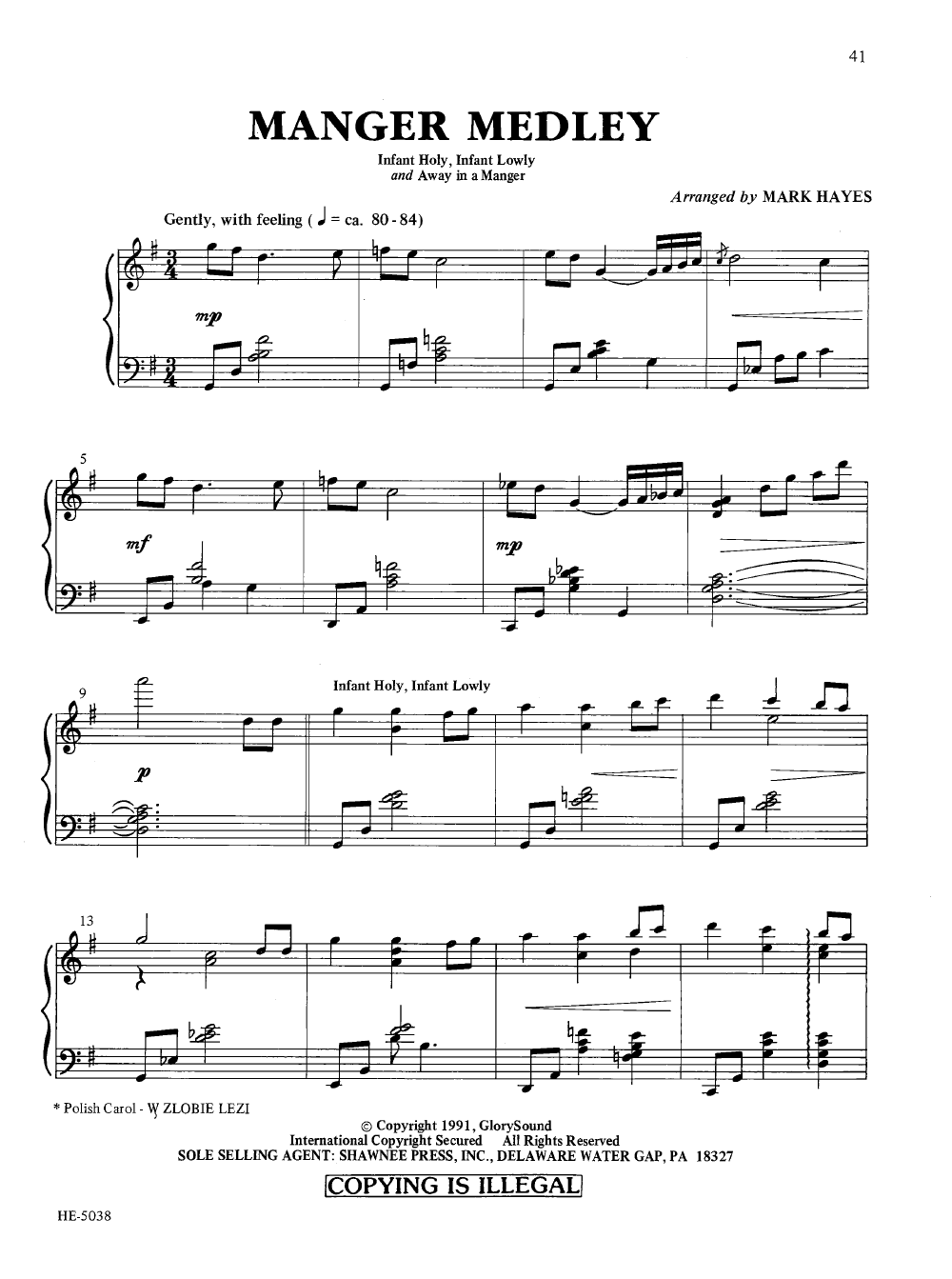 This collection contains something for everyone ... a bluesy spiritual, gentle lullabies, concert pieces, lush settings of old favorites and even a medley of secular titles. Mark Hayes' style is unlike any other. Given to mood and style shifts, one moment the carol is traditional, the next it's in the style of Mozart, and the next it's in the style of Chopin. Some easy, some not so easy, but all are exciting. Highly recommended!