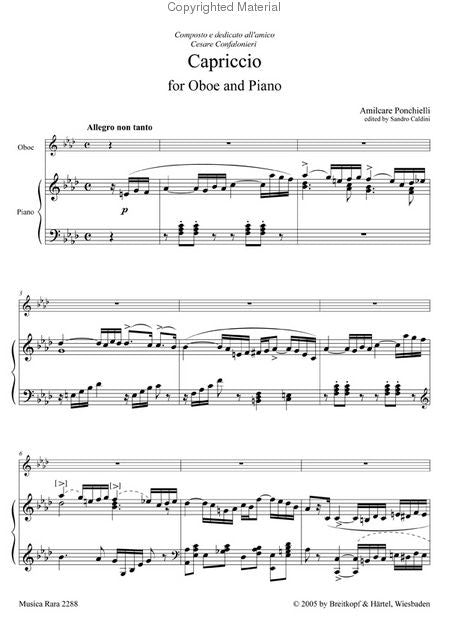 Capriccio composed by Amilcare Ponchielli (1834-1886). Edited by Sandro Caldini. For oboe, piano. 28 pages. Published by Musica Rara (BR.MR-2288).
